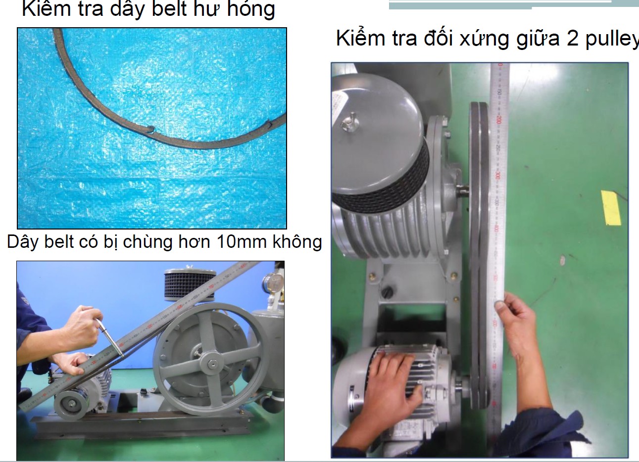 • Kiểm tra độ căng dây: Nếu dây chùng quá 10mm hoặc có dấu hiệu nứt, cần cân chỉnh hoặc thay mới ngay để tránh trượt dây gây nóng máy.