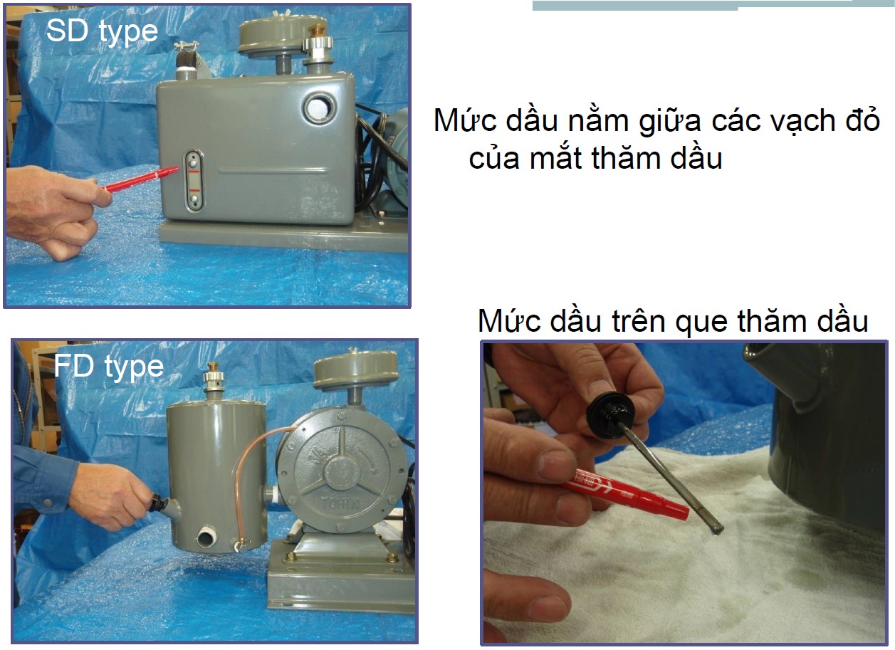 • Quan sát mức dầu qua mắt thăm dầu hoặc que thăm. Đảm bảo mức dầu luôn nằm ở giữa các vạch chỉ định.